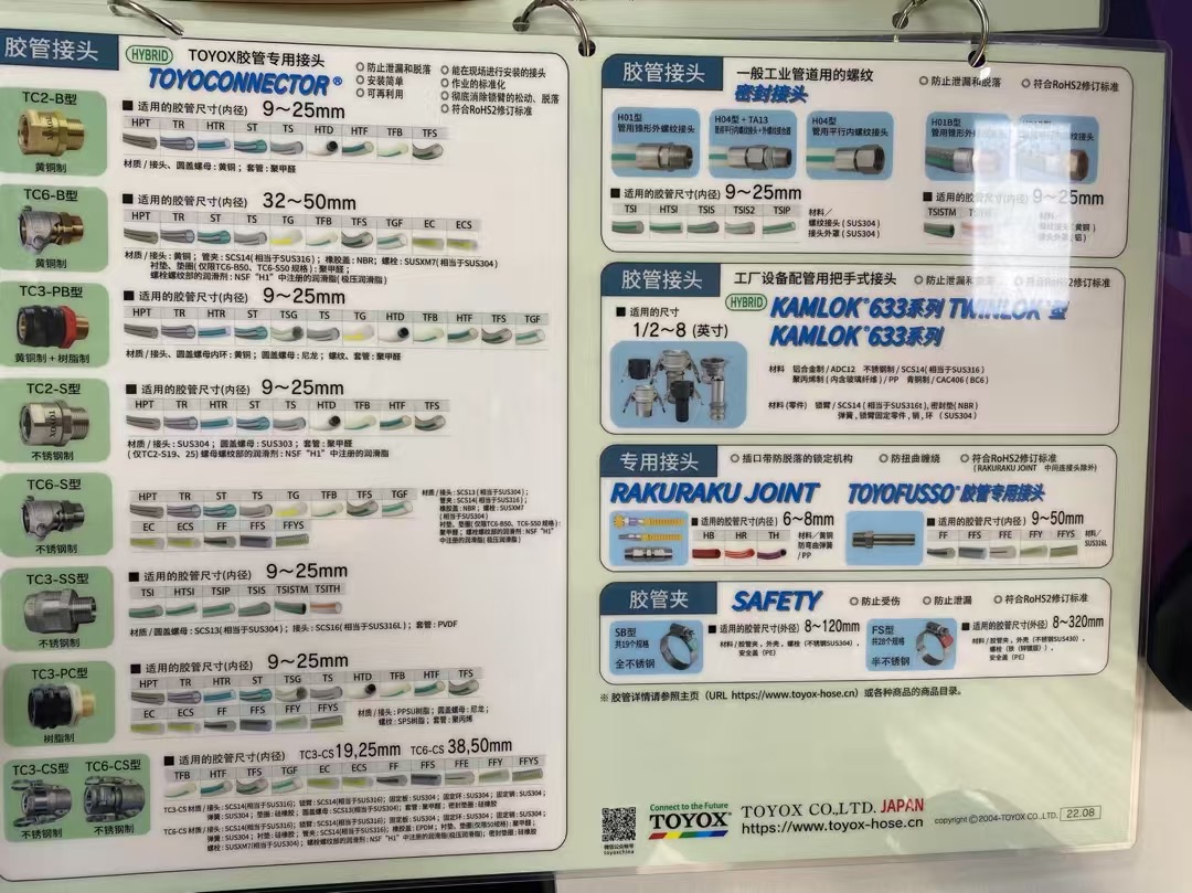 提供豐富的膠管與接頭組合,覆蓋耐熱、耐油、耐藥品、食品級等多種類型,適用于流體輸送領域的多樣化需求。